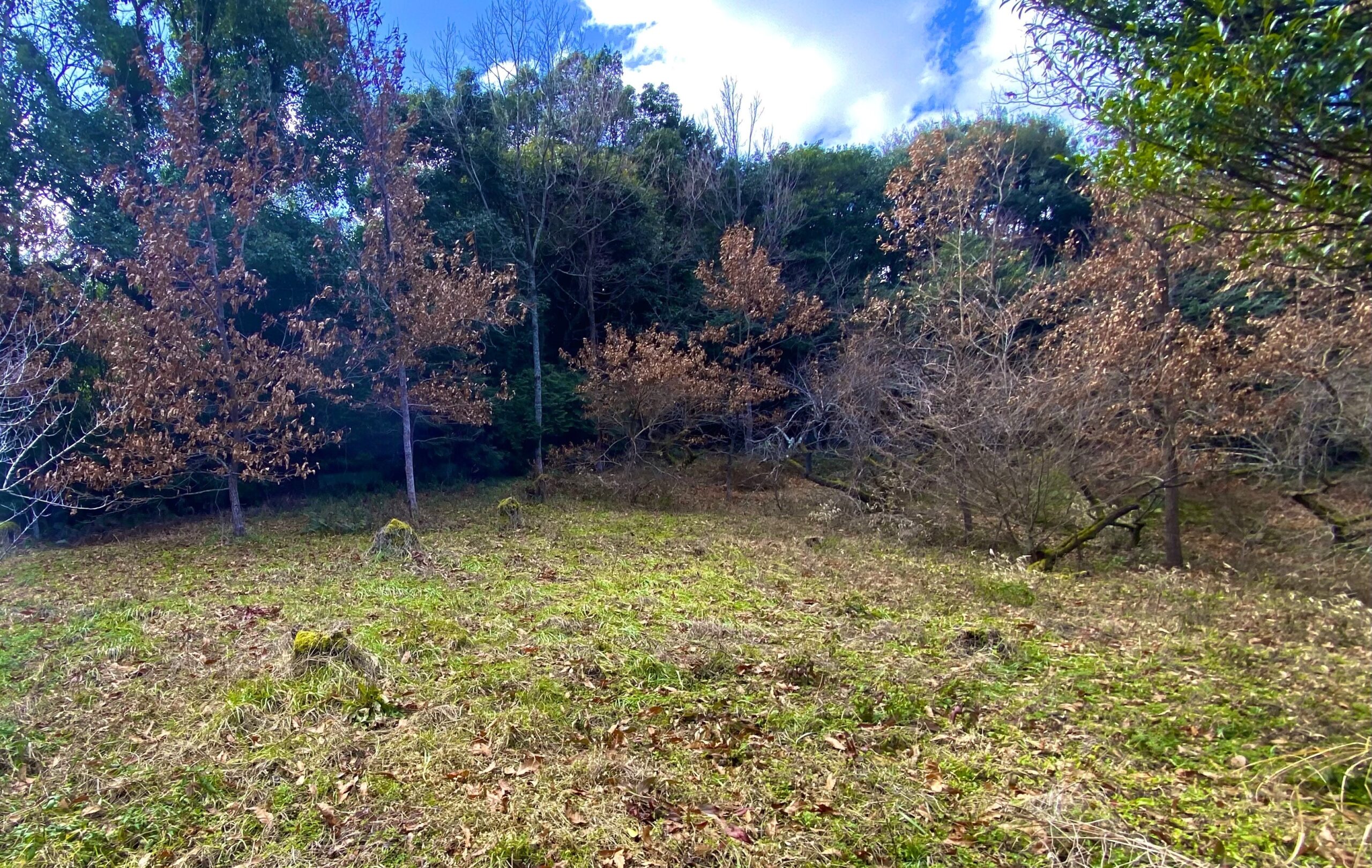 成竹地区の集落から林道を車で進むこと数分。成竹山の麓あたりに今回の土地があります。 まず出迎えてくれたのは、約1,500坪という広大な敷地。入口から続く梅林とススキの小道を進み、ゆるやかな傾斜を登った先には、ふと足を止め …
